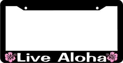 LIVE ALOHA License Plate Frame Plastic License Plate Frame Polystyrene plastic with vinyl graphics. Strong with tabs on the back to secure your plate to the frame. This is a buy it now for the frame pictured It is designed to fit a US/CANADA license plate.