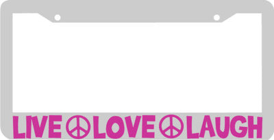 LIVE LOVE LAUGH Peace sign License Plate Frame Plastic License Plate Frame Polystyrene plastic with vinyl graphics. Strong with tabs on the back to secure your plate to the frame. This is a buy it now for the frame pictured It is designed to fit a US/CANADA license plate.