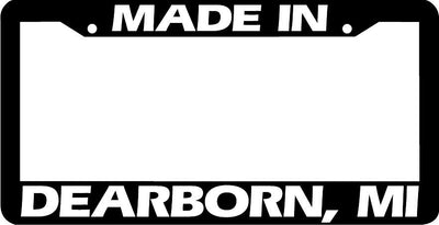 MADE IN DEARBORN, MI License Plate Frame Plastic License Plate Frame Polystyrene plastic with vinyl graphics. Strong with tabs on the back to secure your plate to the frame. This is a buy it now for the frame pictured It is designed to fit a US/CANADA license plate.