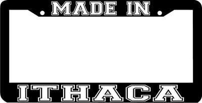 MADE IN ITHACA License Plate Frame Plastic License Plate Frame Polystyrene plastic with vinyl graphics. Strong with tabs on the back to secure your plate to the frame. This is a buy it now for the frame pictured It is designed to fit a US/CANADA license plate.