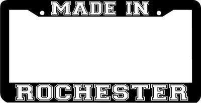 MADE IN ROCHESTER License Plate Frame Plastic License Plate Frame Polystyrene plastic with vinyl graphics. Strong with tabs on the back to secure your plate to the frame. This is a buy it now for the frame pictured It is designed to fit a US/CANADA license plate.