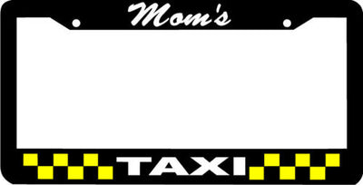 MOM'S TAXI License Plate Frame Plastic License Plate Frame Polystyrene plastic with vinyl graphics. Strong with tabs on the back to secure your plate to the frame. This is a buy it now for the frame pictured It is designed to fit a US/CANADA license plate.