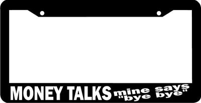 MONEY TALKS MINE SAYS BYE BYE Plastic License Plate Frame Polystyrene plastic with vinyl graphics. Strong with tabs on the back to secure your plate to the frame. This is a buy it now for the frame pictured It is designed to fit a US/CANADA license plate.