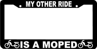 MOPED my other ride is a License Plate Frame Plastic License Plate Frame Polystyrene plastic with vinyl graphics. Strong with tabs on the back to secure your plate to the frame. This is a buy it now for the frame pictured It is designed to fit a US/CANADA license plate.