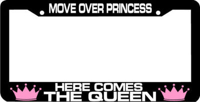 MOVE OVER PRINCESS HERE COMES THE QUEEN License Plate Frame Plastic License Plate Frame Polystyrene plastic with vinyl graphics. Strong with tabs on the back to secure your plate to the frame. This is a buy it now for the frame pictured It is designed to fit a US/CANADA license plate.