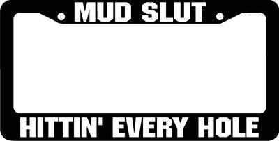 MUD SLUT HITTIN' EVERY HOLE License Plate Frame Plastic License Plate Frame Polystyrene plastic with vinyl graphics. Strong with tabs on the back to secure your plate to the frame. This is a buy it now for the frame pictured It is designed to fit a US/CANADA license plate.