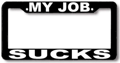 MY JOB SUCKS License Plate Frame Plastic License Plate Frame Polystyrene plastic with vinyl graphics. Strong with tabs on the back to secure your plate to the frame. This is a buy it now for the frame pictured It is designed to fit a US/CANADA license plate.