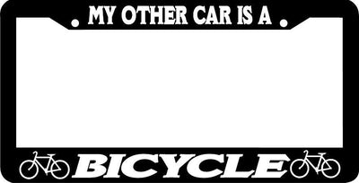 MY OTHER CAR IS A BICYCLE Plastic License Plate Frame Polystyrene plastic with vinyl graphics. Strong with tabs on the back to secure your plate to the frame. This is a buy it now for the frame pictured