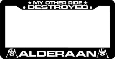 MY OTHER RIDE DESTROYED ALDERAAN License Plate Frame Plastic License Plate Frame Polystyrene plastic with vinyl graphics. Strong with tabs on the back to secure your plate to the frame. This is a buy it now for the frame pictured