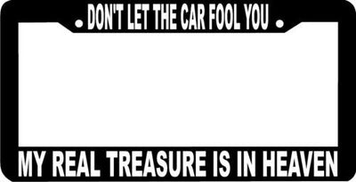 MY TREASURE IS IN HEAVEN License Plate Frame Plastic License Plate Frame Polystyrene plastic with vinyl graphics. Strong with tabs on the back to secure your plate to the frame. This is a buy it now for the frame pictured It is designed to fit a US/CANADA license plate.