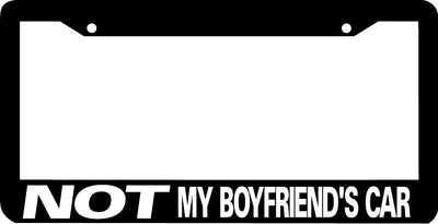 NOT MY BOYFRI'S CAR License Plate Frame Plastic License Plate Frame Polystyrene plastic with vinyl graphics. Strong with tabs on the back to secure your plate to the frame. This is a buy it now for the frame pictured It is designed to fit a US/CANADA license plate.