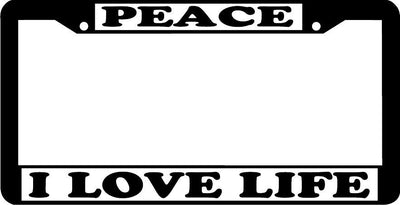 PEACE I LOVE LIFE License Plate Frame Plastic License Plate Frame Polystyrene plastic with vinyl graphics. Strong with tabs on the back to secure your plate to the frame. This is a buy it now for the frame pictured