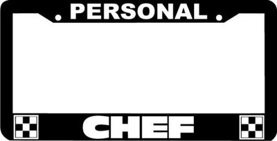 PERSONAL CHEF License Plate Frame Plastic License Plate Frame Polystyrene plastic with vinyl graphics. Strong with tabs on the back to secure your plate to the frame. This is a buy it now for the frame pictured It is designed to fit a US/CANADA license plate.