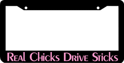 REAL CHICKS DRIVE STICKS License Plate Frame Plastic License Plate Frame Polystyrene plastic with vinyl graphics. Strong with tabs on the back to secure your plate to the frame. This is a buy it now for the frame pictured It is designed to fit a US/CANADA license plate.