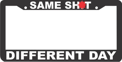 SAME SH*T DIFFERENT DAY License Plate Frame Plastic License Plate Frame Polystyrene plastic with vinyl graphics. Strong with tabs on the back to secure your plate to the frame. This is a buy it now for the frame pictured It is designed to fit a US/CANADA license plate.