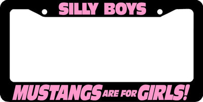SILLY BOYS MUSTANGS ARE FOR GIRLS License Plate Frame Plastic License Plate Frame Polystyrene plastic with vinyl graphics. Strong with tabs on the back to secure your plate to the frame. This is a buy it now for the frame pictured It is designed to fit a US/CANADA license plate.
