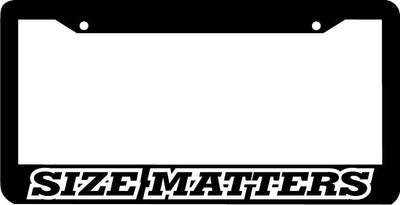 SIZE MATTERS License Plate Frame Plastic License Plate Frame Polystyrene plastic with vinyl graphics. Strong with tabs on the back to secure your plate to the frame. This is a buy it now for the frame pictured It is designed to fit a US/CANADA license plate.