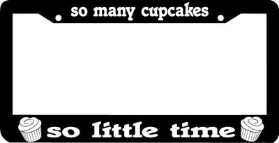 SO MANY CUPCAKES SO LITTLE TIME License Plate Frame Plastic License Plate Frame Polystyrene plastic with vinyl graphics. Strong with tabs on the back to secure your plate to the frame. This is a buy it now for the frame pictured It is designed to fit a US/CANADA license plate.