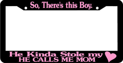 SO THERE'S THIS BOY HE KINDA STOLE MY HE CALLS ME MOM License Plate Frame Plastic License Plate Frame Polystyrene plastic with vinyl graphics. Strong with tabs on the back to secure your plate to the frame. This is a buy it now for the frame pictured It is designed to fit a US/CANADA license plate.