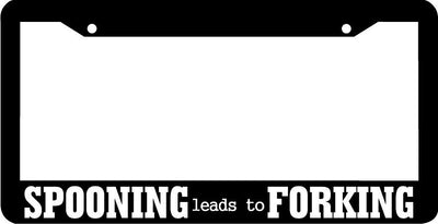 SPOONING LEADS TO FORKING License Plate Frame Plastic License Plate Frame Polystyrene plastic with vinyl graphics. Strong with tabs on the back to secure your plate to the frame. This is a buy it now for the frame pictured It is designed to fit a US/CANADA license plate.
