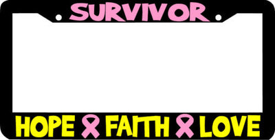 SURVIVOR Hope Faith Love breast Plate Frame Plastic License Plate Frame Polystyrene plastic with vinyl graphics. Strong with tabs on the back to secure your plate to the frame. This is a buy it now for the frame pictured It is designed to fit a US/CANADA license plate.