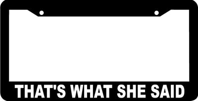 THAT'S WHAT SHE SAID Plastic License Plate Frame Polystyrene plastic with vinyl graphics. Strong with tabs on the back to secure your plate to the frame. This is a buy it now for the frame pictured