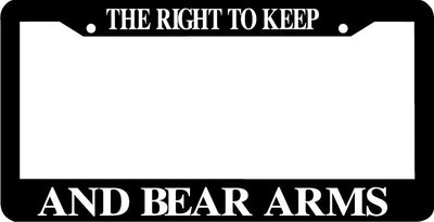 THE RIGHT TO KEEP AND BEAR ARMS License Plate Frame Plastic License Plate Frame Polystyrene plastic with vinyl graphics. Strong with tabs on the back to secure your plate to the frame. This is a buy it now for the frame pictured It is designed to fit a US/CANADA license plate.