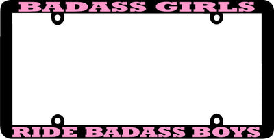 Thin Frame BADASS GIRLS RIDE BADASS BOYS License Plate Frame Plastic License Plate Frame Polystyrene plastic with vinyl graphics. Strong with tabs on the back to secure your plate to the frame. This is a buy it now for the frame pictured It is designed to fit a US/CANADA license plate.