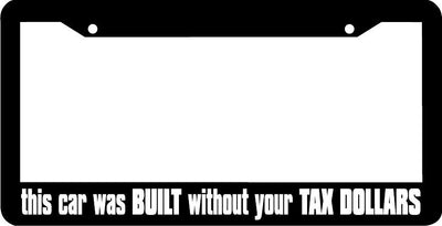 THIS CAR WAS BUILT WITHOUT YOUR TAX DOLLARS Plastic License Plate Frame Polystyrene plastic with vinyl graphics. Strong with tabs on the back to secure your plate to the frame. This is a buy it now for the frame pictured It is designed to fit a US/CANADA license plate.