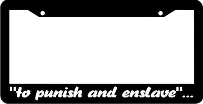 To Punish and enslave License Plate Frame Plastic License Plate Frame Polystyrene plastic with vinyl graphics. Strong with tabs on the back to secure your plate to the frame. This is a buy it now for the frame pictured It is designed to fit a US/CANADA license plate.