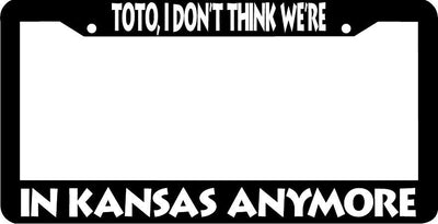 TOTO I DON'T THINK WE'RE IN KANSAS ANYMORE License Plate Frame Plastic License Plate Frame Polystyrene plastic with vinyl graphics. Strong with tabs on the back to secure your plate to the frame. This is a buy it now for the frame pictured It is designed to fit a US/CANADA license plate.