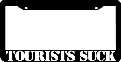 TOURISTS SUCK License Plate Frame Plastic License Plate Frame Polystyrene plastic with vinyl graphics. Strong with tabs on the back to secure your plate to the frame. This is a buy it now for the frame pictured It is designed to fit a US/CANADA license plate.