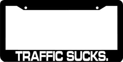 TRAFFIC SUCKS License Plate Frame Plastic License Plate Frame Polystyrene plastic with vinyl graphics. Strong with tabs on the back to secure your plate to the frame. This is a buy it now for the frame pictured It is designed to fit a US/CANADA license plate.