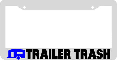 TRAILER TRASH License Plate Frame Plastic License Plate Frame Polystyrene plastic with vinyl graphics. Strong with tabs on the back to secure your plate to the frame. This is a buy it now for the frame pictured It is designed to fit a US/CANADA license plate.