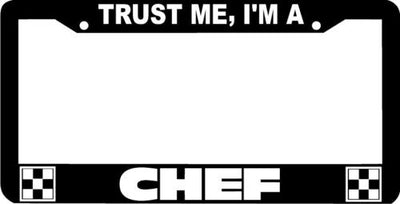 TRUST ME I'M A CHEF License Plate Frame Plastic License Plate Frame Polystyrene plastic with vinyl graphics. Strong with tabs on the back to secure your plate to the frame. This is a buy it now for the frame pictured It is designed to fit a US/CANADA license plate.