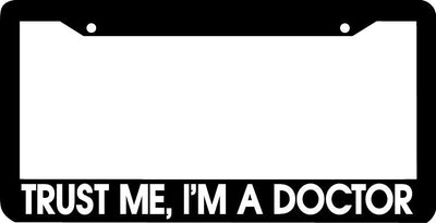 TRUST ME I'M A DOCTOR Plastic License Plate Frame Polystyrene plastic with vinyl graphics. Strong with tabs on the back to secure your plate to the frame. This is a buy it now for the frame pictured