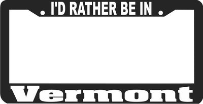 I'D RATHER BE I N License Plate Frame VERMONT Plastic License Plate Frame Polystyrene plastic with vinyl graphics. Strong with tabs on the back to secure your plate to the frame. This is a buy it now for the frame pictured It is designed to fit a US/CANADA license plate.