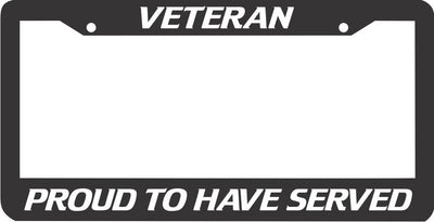 VETERAN PROUD TO HAVE SERVED License Plate Frame Plastic License Plate Frame Polystyrene plastic with vinyl graphics. Strong with tabs on the back to secure your plate to the frame. This is a buy it now for the frame pictured It is designed to fit a US/CANADA license plate.