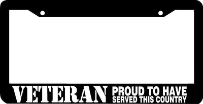 VETERAN PROUD TO HAVE SERVED THIS COUNTRY LICENSE PLATE FRAME Plastic License Plate Frame Polystyrene plastic with vinyl graphics. Strong with tabs on the back to secure your plate to the frame. This is a buy it now for the frame pictured