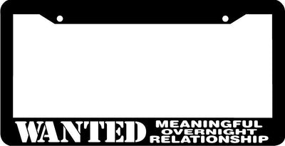 WANTED Overnight meaningful relationship License Plate Frame Plastic License Plate Frame Polystyrene plastic with vinyl graphics. Strong with tabs on the back to secure your plate to the frame. This is a buy it now for the frame pictured It is designed to fit a US/CANADA license plate.