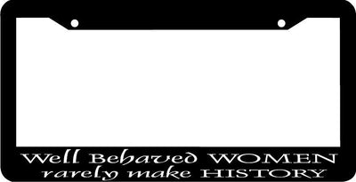 WELL BEHAVED WOMEN RARELY MAKE HISTORY Plastic License Plate Frame Polystyrene plastic with vinyl graphics. Strong with tabs on the back to secure your plate to the frame. This is a buy it now for the frame pictured It is designed to fit a US/CANADA license plate.