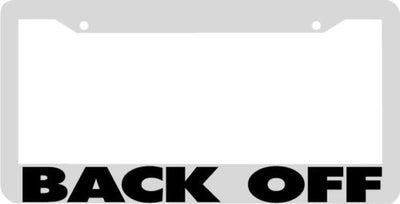 BACK OFF License Plate Frame Plastic License Plate Frame Polystyrene plastic with vinyl graphics. Strong with tabs on the back to secure your plate to the frame. This is a buy it now for the frame pictured It is designed to fit a US/CANADA license plate.