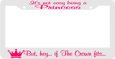 It's not easy being a PRINCESS But Hey, if the fits.... PLASTIC License Plate Frame Plastic License Plate Frame Polystyrene plastic with vinyl graphics. Strong with tabs on the back to secure your plate to the frame. This is a buy it now for the frame pictured It is designed to fit a US/CANADA license plate.