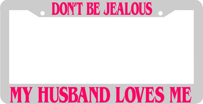 DON'T BE JEALOUS MY HUSBAND LOVES ME License Plate Frame Plastic License Plate Frame Polystyrene plastic with vinyl graphics. Strong with tabs on the back to secure your plate to the frame. This is a buy it now for the frame pictured It is designed to fit a US/CANADA license plate.