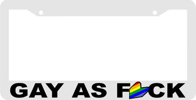 GAY AS FCK Plastic License Plate Frame Polystyrene plastic with vinyl graphics. Strong with tabs on the back to secure your plate to the frame. This is a buy it now for the frame pictured It is designed to fit a US/CANADA license plate.