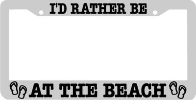 I'd rather be THE BEACH License Plate Frame Plastic License Plate Frame Polystyrene plastic with vinyl graphics. Strong with tabs on the back to secure your plate to the frame. This is a buy it now for the frame pictured It is designed to fit a US/CANADA license plate.