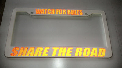 WHITE WATCH FOR BIKES SHARE THE ROAD RED License Plate Frame REFLECTIVE