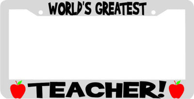 World's Greatest TEACHER License Plate Frame Plastic License Plate Frame Polystyrene plastic with vinyl graphics. Strong with tabs on the back to secure your plate to the frame. This is a buy it now for the frame pictured It is designed to fit a US/CANADA license plate.