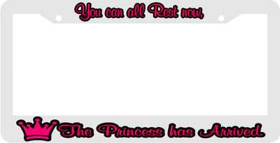 WHITE- YOU CAN ALL REST NOW THE PRINCESS HAS ARRIVED funny License Plate Frame