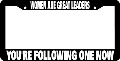 WOMEN ARE GREAT LEADERS YOU'RE FOLLOWING NOW License Plate Frame Plastic License Plate Frame Polystyrene plastic with vinyl graphics. Strong with tabs on the back to secure your plate to the frame. This is a buy it now for the frame pictured It is designed to fit a US/CANADA license plate.